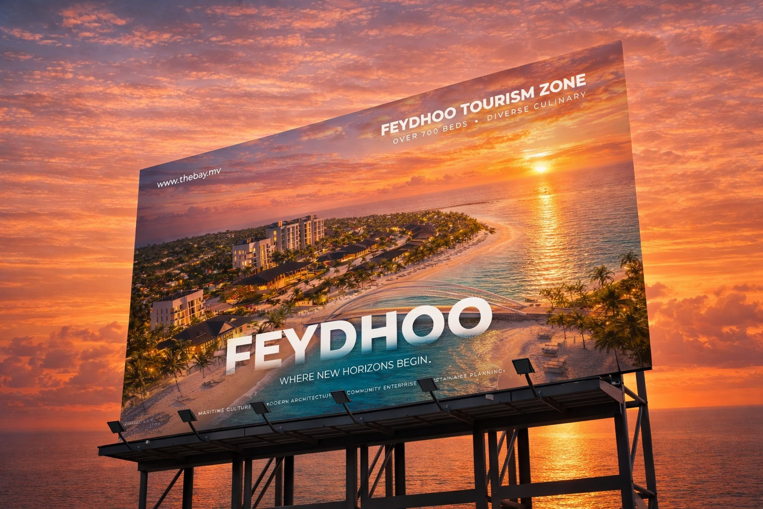 A strategic tourism masterplan and brand identity for Feydhoo, blending coastal resort design, community connection and investor appeal — realized through masterplan visualization, destination branding and promotional billboard concepts.